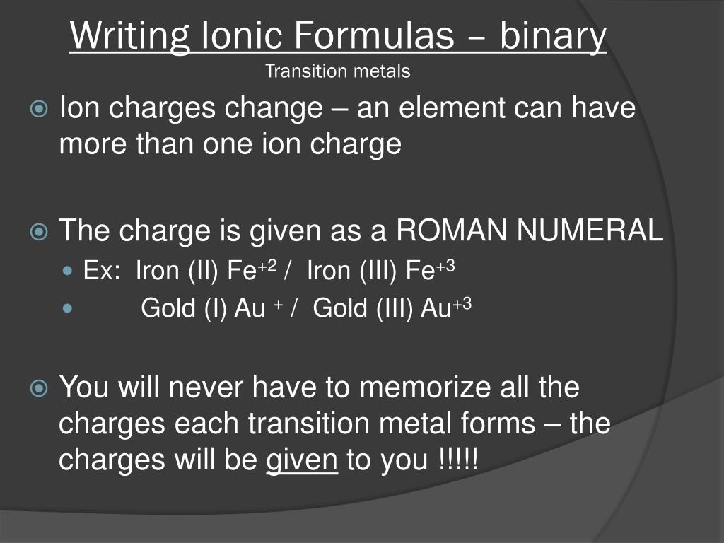 Writing Ionic Formulas – binaryTransition metals • Ion charges change – an element can have more than one ion charge • The charge is given as a ROMAN NUMERAL • Ex: Iron (II) Fe+2 / Iron (III) Fe+3 • Gold (I) Au + / Gold (III) Au+3 • You will never have to memorize all the charges each transition metal forms – the charges will be given to you !!!!!