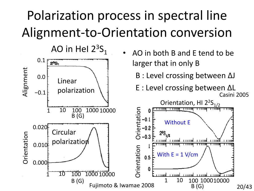 Polarization process in spectral lineAlignment-to-Orientation conversion AO in HeI 23S1 • AO in both B and E tend to be larger that in only B B : Level crossing between ΔJ E : Level crossing between ΔL 0.1 0.0 Linear polarization Alignment −0.1 Casini 2005 Orientation, HI 22S1/2 10 1000 100 10000 1 B (G) Without E Orientation 0.020 Circular polarization 0.010 Orientation With E = 1 V/cm Orientation 0.000 10 1000 100 10000 1 Fujimoto 10 1 1000 10000 100 B (G) Fujimoto & Iwamae 2008 B (G) 20/43