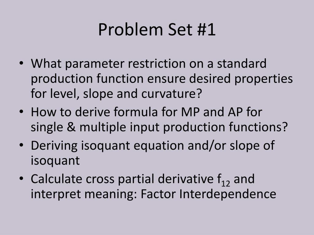 Problem Set #1 • What parameter restriction on a standard production function ensure desired properties for level, slope and curvature? • How to derive formula for MP and AP for single & multiple input production functions? • Deriving isoquant equation and/or slope of isoquant • Calculate cross partial derivative f12 and interpret meaning: Factor Interdependence