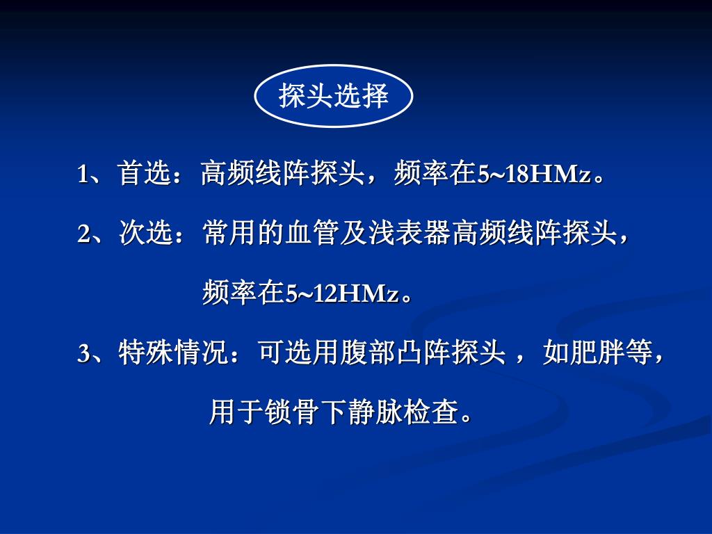 探头选择 1、首选:高频线阵探头,频率在518HMz。 2、次选:常用的血管及浅表器高频线阵探头, 频率在512HMz。 3、特殊情况:可选用腹部凸阵探头 ,如肥胖等, 用于锁骨下静脉检查。