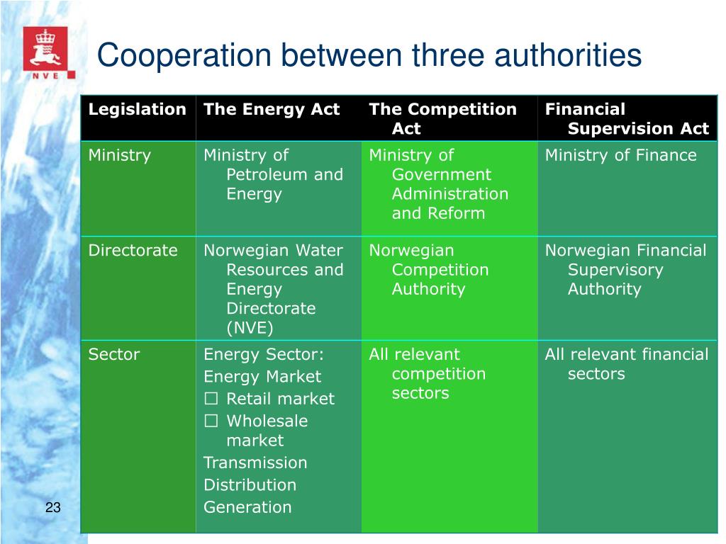 Cooperation with other Supervisory Authorities • NVE, The Competition Authority and The Financial supervisory Authority have entered into a supervisory cooperation. • All three authorities govern different regulations, however they share the goal of “an efficient power market” • Within this cooperation the authorities wish to: • Address common issues regarding development of regulations • Exchange information and experiences • Cooperate on common projects • Coordinate the supervision of particular incidents or activities • In addition, bilateral cooperation arrangements handling cases