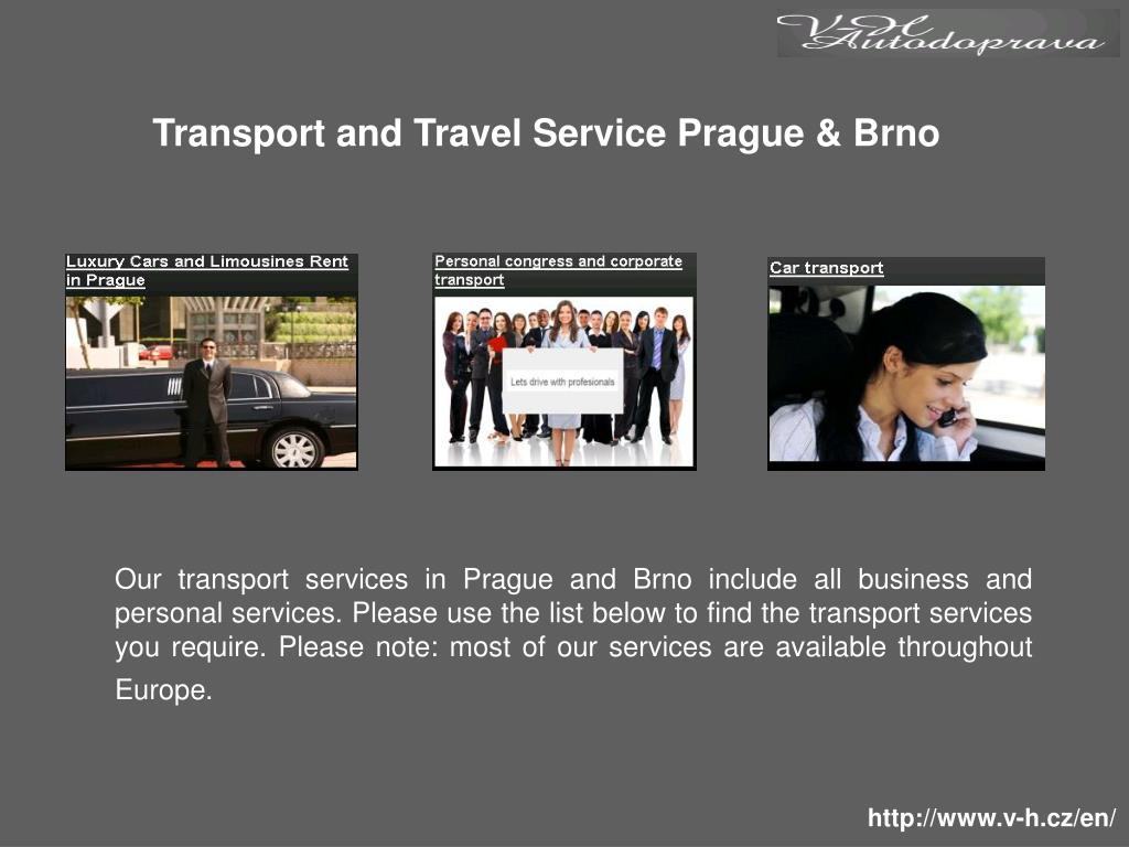 Transport and Travel Service Prague & Brno Our transport services in Prague and Brno include all business and personal services. Please use the list below to find the transport services you require. Please note: most of our services are available throughout Europe.