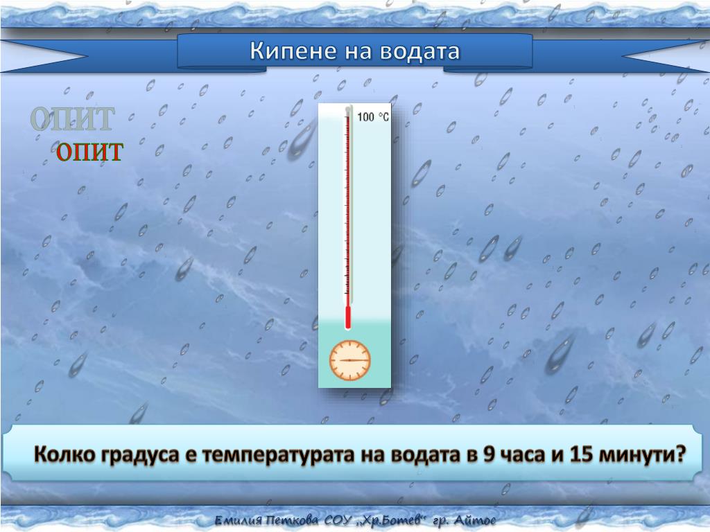 Кипене на водата опит Колко градуса е температурата на водата в 9 часа и 15 минути?