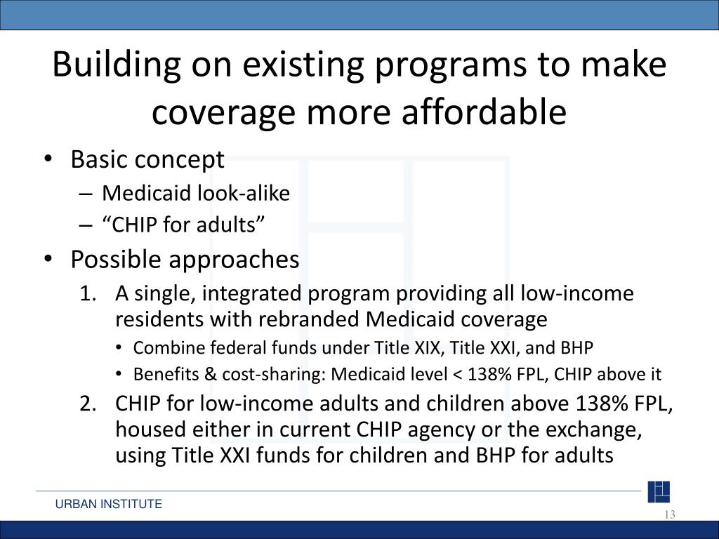 Building on existing programs to make coverage more affordable • Basic concept • Medicaid look-alike • “CHIP for adults” • Possible approaches • A single, integrated program providing all low-income residents with rebranded Medicaid coverage • Combine federal funds under Title XIX, Title XXI, and BHP • Benefits & cost-sharing: Medicaid level < 138% FPL, CHIP above it • CHIP for low-income adults and children above 138% FPL, housed either in current CHIP agency or the exchange, using Title XXI funds for children and BHP for adults