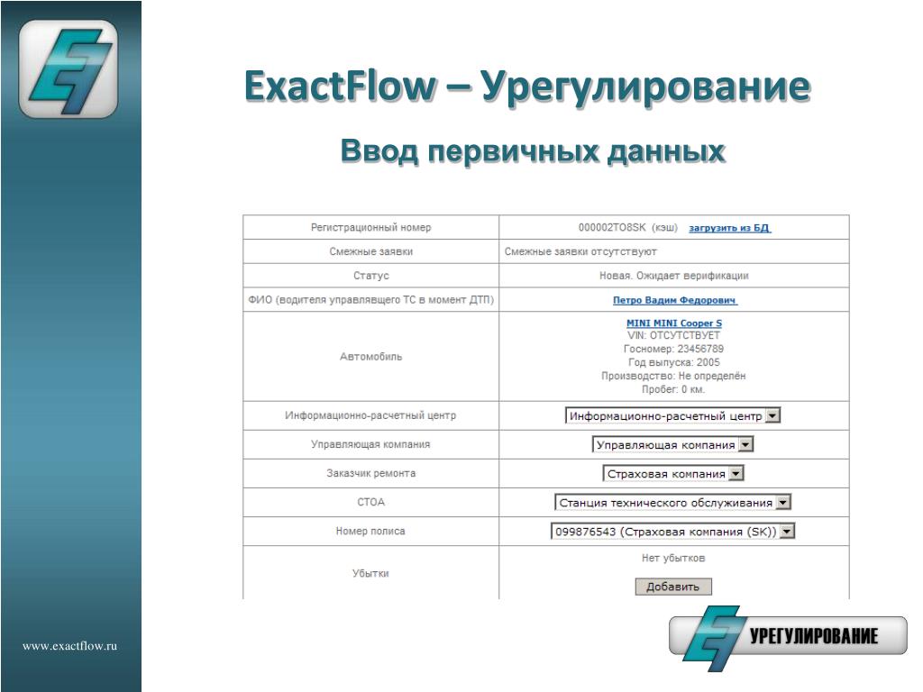 ExactFlow – Урегулирование Система электронного документооборота. Пример работы в системе: «Прохождение заявки на ремонт по страховому случаю». Москва, 200 9 год. ExactFlow – Урегулирование. Общая схема бизнес-процесса. ExactFlow – Урегулирование. Ввод первичных данных.