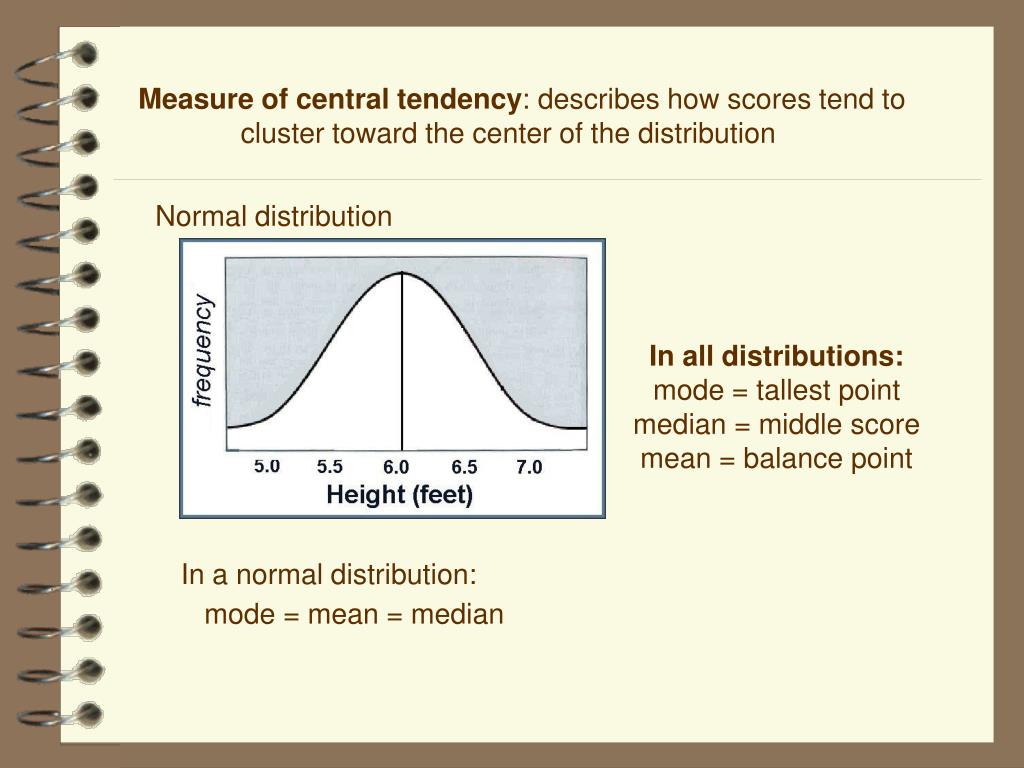 Measure of central tendency: describes how scores tend to cluster toward the center of the distribution Normal distribution In all distributions: mode = tallest point median = middle score mean = balance point In a normal distribution: mode = mean = median
