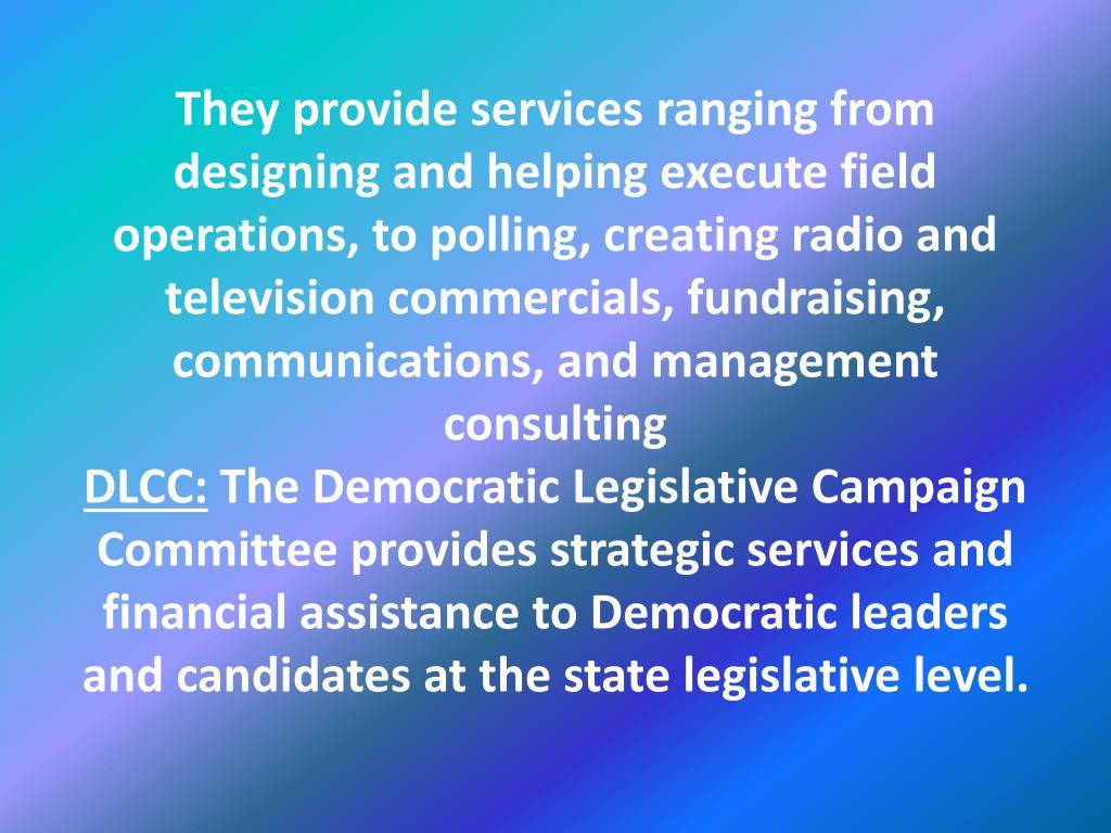 They provide services ranging from designing and helping execute field operations, to polling, creating radio and television commercials, fundraising, communications, and management consultingDLCC: The Democratic Legislative Campaign Committee provides strategic services and financial assistance to Democratic leaders and candidates at the state legislative level.