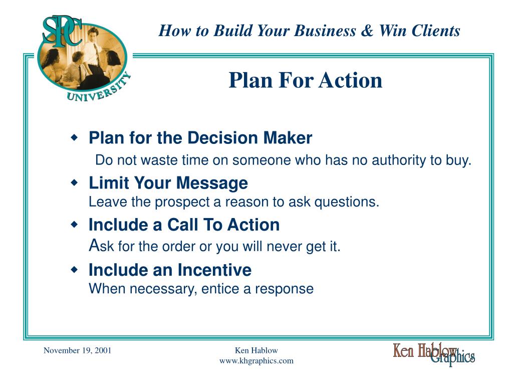 Plan For Action • Plan for the Decision Maker Do not waste time on someone who has no authority to buy. • Limit Your MessageLeave the prospect a reason to ask questions. • Include a Call To ActionAsk for the order or you will never get it. • Include an IncentiveWhen necessary, entice a response Ken Hablow www.khgraphics.com