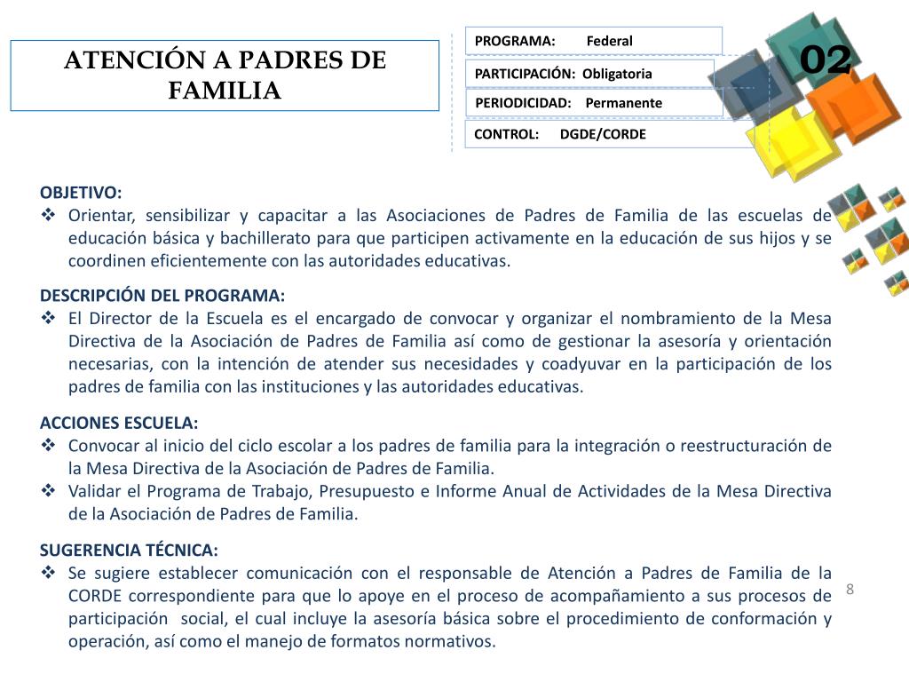 PROGRAMA: Federal 02 ATENCIÓN A PADRES DE FAMILIA PARTICIPACIÓN: Obligatoria PERIODICIDAD: Permanente CONTROL: DGDE/CORDE • OBJETIVO: • Orientar, sensibilizar y capacitar a las Asociaciones de Padres de Familia de las escuelas de educación básica y bachillerato para que participen activamente en la educación de sus hijos y se coordinen eficientemente con las autoridades educativas. • DESCRIPCIÓN DEL PROGRAMA: • El Director de la Escuela es el encargado de convocar y organizar el nombramiento de la Mesa Directiva de la Asociación de Padres de Familia así como de gestionar la asesoría y orientación necesarias, con la intención de atender sus necesidades y coadyuvar en la participación de los padres de familia con las instituciones y las autoridades educativas. • ACCIONES ESCUELA: • Convocar al inicio del ciclo escolar a los padres de familia para la integración o reestructuración de la Mesa Directiva de la Asociación de Padres de Familia. • Validar el Programa de Trabajo, Presupuesto e Informe Anual de Actividades de la Mesa Directiva de la Asociación de Padres de Familia. • SUGERENCIA TÉCNICA: • Se sugiere establecer comunicación con el responsable de Atención a Padres de Familia de la CORDE correspondiente para que lo apoye en el proceso de acompañamiento a sus procesos de participación social, el cual incluye la asesoría básica sobre el procedimiento de conformación y operación, así como el manejo de formatos normativos.