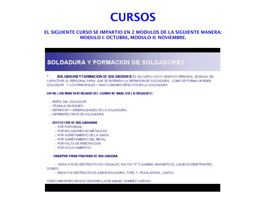 CURSOS EL SIGUIENTE CURSO SE IMPARTIO EN 2 MODULOS DE LA SIGUIENTE MANERA: MODULO I: OCTUBRE, MODULO II: NOVIEMBRE.