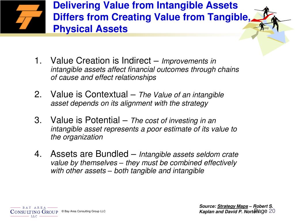 Delivering Value from Intangible Assets Differs from Creating Value from Tangible, Physical Assets • Value Creation is Indirect – Improvements in intangible assets affect financial outcomes through chains of cause and effect relationships • Value is Contextual – The Value of an intangible asset depends on its alignment with the strategy • Value is Potential – The cost of investing in an intangible asset represents a poor estimate of its value to the organization • Assets are Bundled – Intangible assets seldom crate value by themselves – they must be combined effectively with other assets – both tangible and intangible Source: Strategy Maps – Robert S. Kaplan and David P. Norton