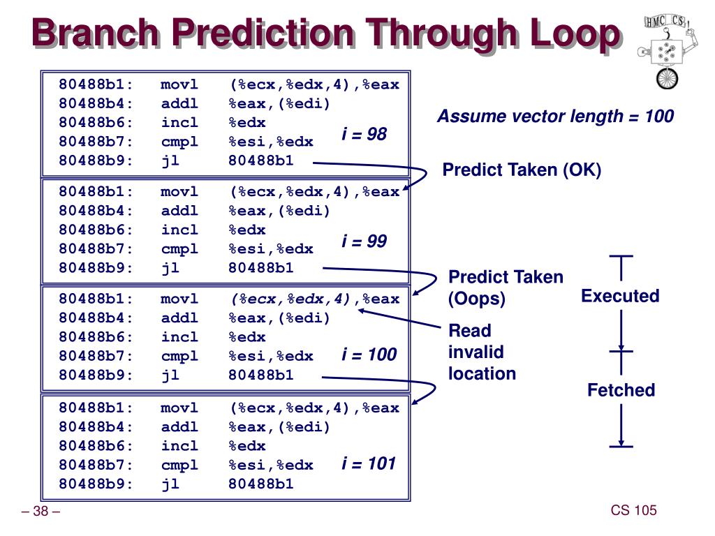 Branch Prediction Through Loop 80488b1: movl (%ecx,%edx,4),%eax 80488b4: addl %eax,(%edi) 80488b6: incl %edx 80488b7: cmpl %esi,%edx 80488b9: jl 80488b1 Assume vector length = 100 i = 98 Predict Taken (OK) 80488b1: movl (%ecx,%edx,4),%eax 80488b4: addl %eax,(%edi) 80488b6: incl %edx 80488b7: cmpl %esi,%edx 80488b9: jl 80488b1 i = 99 Predict Taken (Oops) Executed 80488b1: movl (%ecx,%edx,4),%eax 80488b4: addl %eax,(%edi) 80488b6: incl %edx 80488b7: cmpl %esi,%edx 80488b9: jl 80488b1 Read invalid location i = 100 Fetched 80488b1: movl (%ecx,%edx,4),%eax 80488b4: addl %eax,(%edi) 80488b6: incl %edx 80488b7: cmpl %esi,%edx 80488b9: jl 80488b1 i = 101