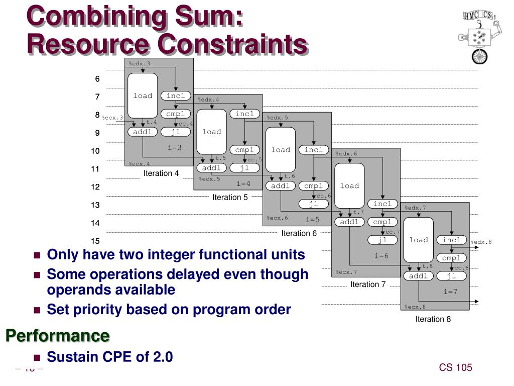 Combining Sum:Resource Constraints • Only have two integer functional units • Some operations delayed even though operands available • Set priority based on program order • Performance • Sustain CPE of 2.0