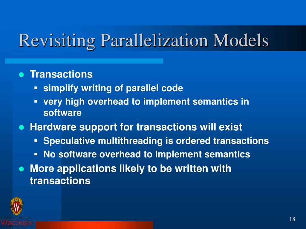 Revisiting Parallelization Models • Transactions • simplify writing of parallel code • very high overhead to implement semantics in software • Hardware support for transactions will exist • Speculative multithreading is ordered transactions • No software overhead to implement semantics • More applications likely to be written with transactions
