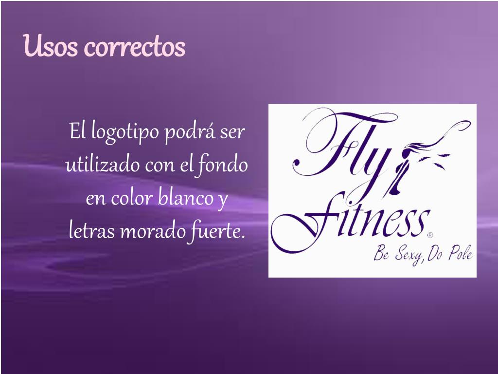 Logotipo • La tipografía Edwardian Sriptt ITC, será la fuente utilizada para los títulos. • FlyFitness: salir de lo común con «clases de tubo» apostar por el trabajo físico de las alumnas. • Remite al espectador a elegancia, movimiento y dinamismo • Uso de grecas, mariposas y plumas: viento, libertad. • Los colores de base son morado, chocolate y aqua. • El logotipo y slogan en morado, negro, verde, rosa y azul neón.
