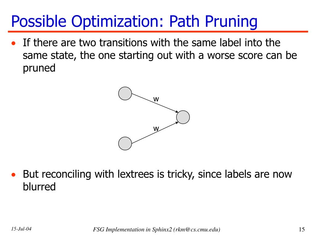 w w Possible Optimization: Path Pruning • If there are two transitions with the same label into the same state, the one starting out with a worse score can be pruned • But reconciling with lextrees is tricky, since labels are now blurred FSG Implementation in Sphinx2 (rkm@cs.cmu.edu)