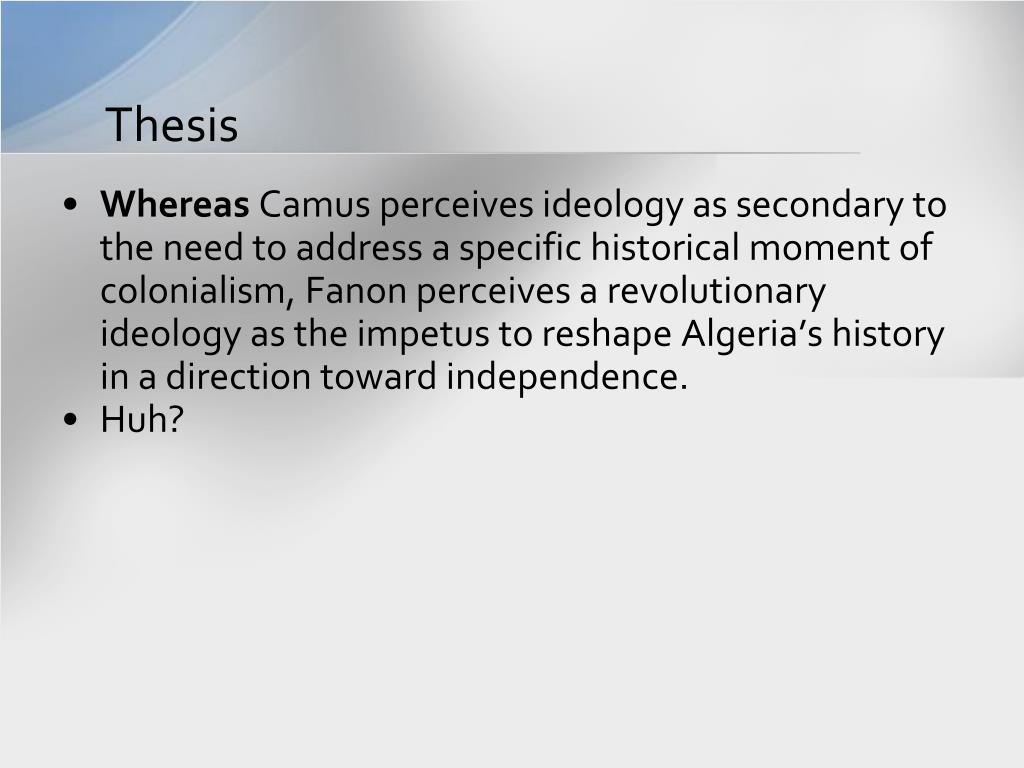 Thesis • Whereas Camus perceives ideology as secondary to the need to address a specific historical moment of colonialism, Fanon perceives a revolutionary ideology as the impetus to reshape Algeria’s history in a direction toward independence. • Huh?