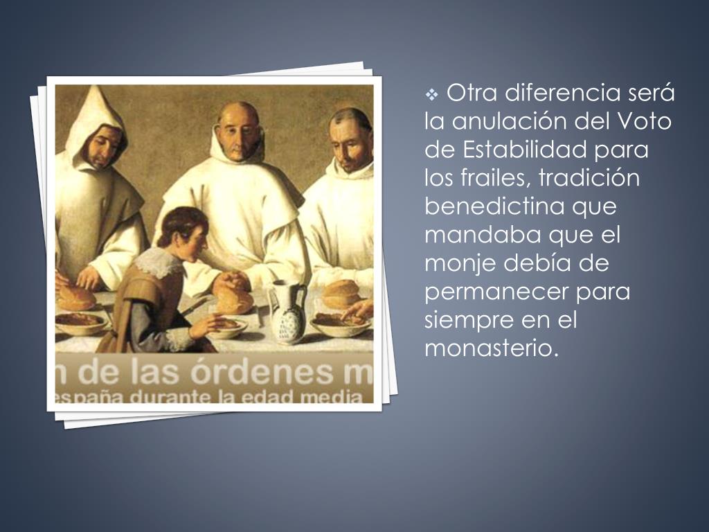 Otra diferencia será la anulación del Voto de Estabilidad para los frailes, tradición benedictina que mandaba que el monje debía de permanecer para siempre en el monasterio.
