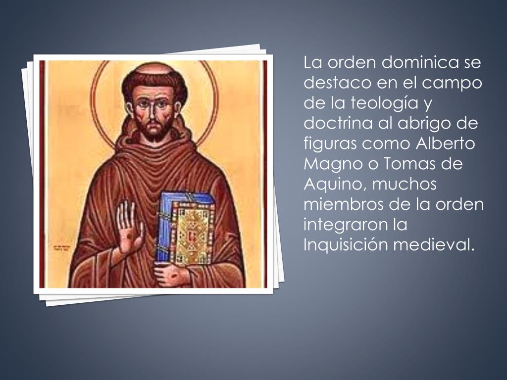 La orden dominica se destaco en el campo de la teología y doctrina al abrigo de figuras como Alberto Magno o Tomas de Aquino, muchos miembros de la orden integraron la Inquisición medieval.