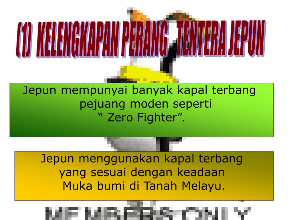 (1) KELENGKAPAN PERANG TENTERA JEPUN Jepun mempunyai banyak kapal terbang pejuang moden seperti “ Zero Fighter”. Jepun menggunakan kapal terbang yang sesuai dengan keadaan Muka bumi di Tanah Melayu.