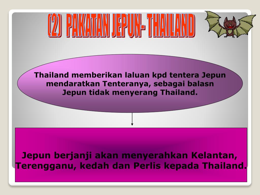 (2) PAKATAN JEPUN- THAILAND Thailand memberikan laluan kpd tentera Jepun mendaratkan Tenteranya, sebagai balasn Jepun tidak menyerang Thailand. Jepun berjanji akan menyerahkan Kelantan, Terengganu, kedah dan Perlis kepada Thailand.