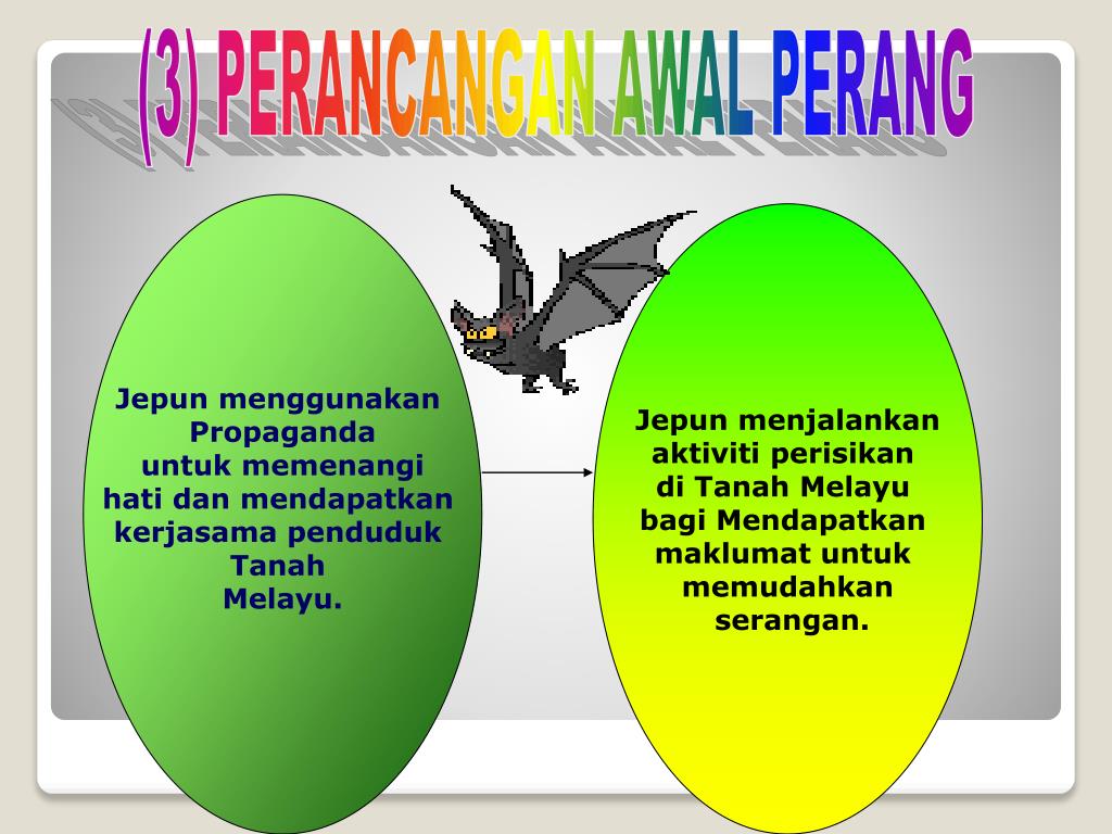 (3) PERANCANGAN AWAL PERANG Jepun menggunakan Propaganda untuk memenangi hati dan mendapatkan kerjasama penduduk Tanah Melayu. Jepun menjalankan aktiviti perisikan di Tanah Melayu bagi Mendapatkan maklumat untuk memudahkan serangan.