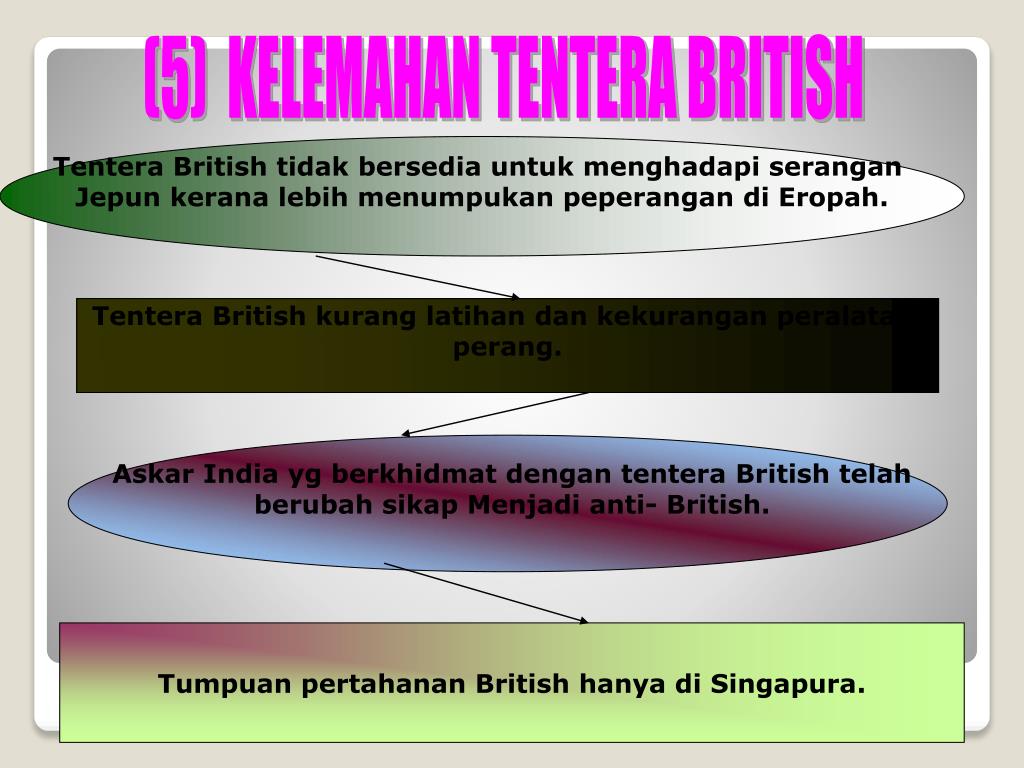 (5) KELEMAHAN TENTERA BRITISH Tentera British tidak bersedia untuk menghadapi serangan Jepun kerana lebih menumpukan peperangan di Eropah. Tentera British kurang latihan dan kekurangan peralatan perang. Askar India yg berkhidmat dengan tentera British telah berubah sikap Menjadi anti- British. Tumpuan pertahanan British hanya di Singapura.
