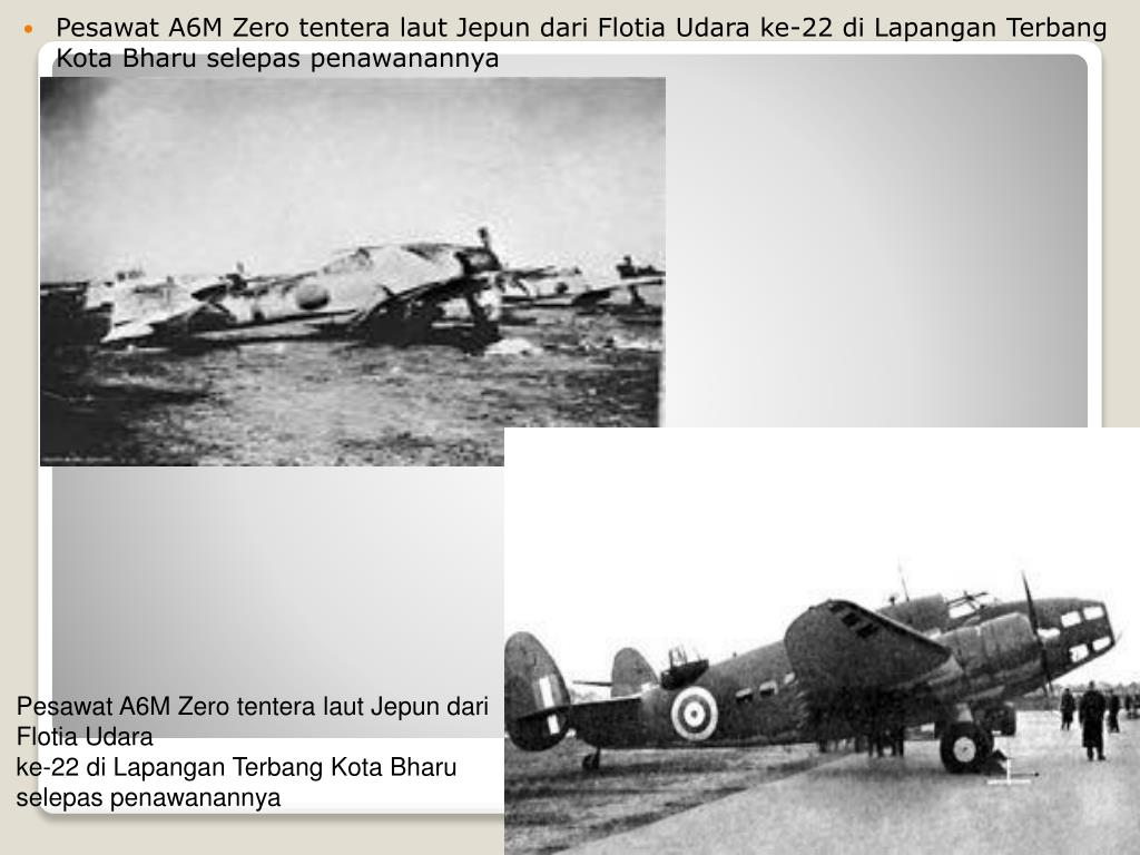 Pesawat A6M Zero tentera laut Jepun dari Flotia Udara ke-22 di Lapangan Terbang Kota Bharu selepas penawanannya Pesawat A6M Zero tentera laut Jepun dari Flotia Udara ke-22 di Lapangan Terbang Kota Bharu selepas penawanannya
