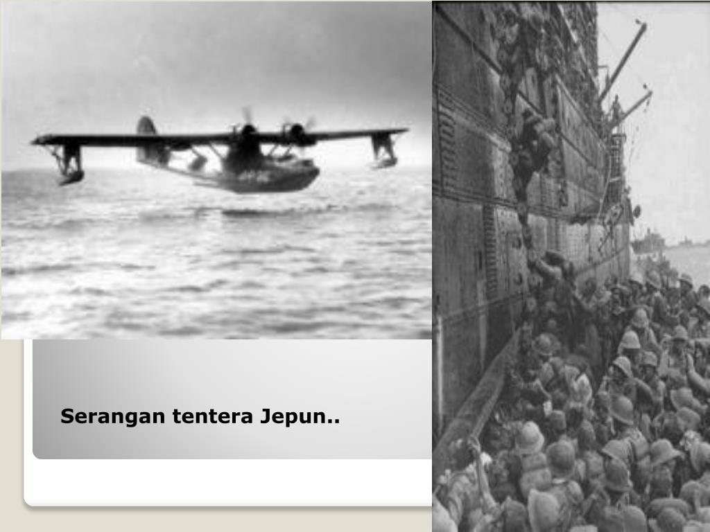 (4) TAKTIK SERANGAN JEPUN Jepun memusnahkan Pearl Harbour di Hawaii, yg menjadi pangkalanUtama tentera Amerika Syarikat di Asia Pasifik. Jepun memulakan serangan dari Utara Tanah Melayu kerana Pertahanan utama British tertumpu di Singapura.