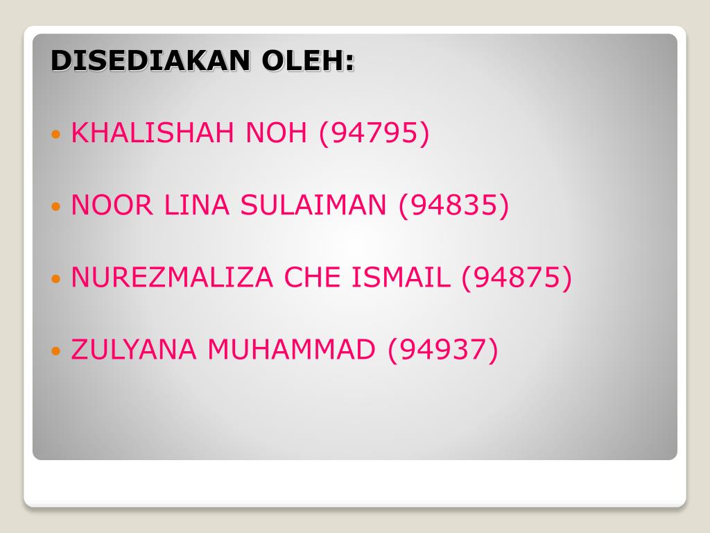 DISEDIAKAN OLEH: • KHALISHAH NOH (94795) • NOOR LINA SULAIMAN (94835) • NUREZMALIZA CHE ISMAIL (94875) • ZULYANA MUHAMMAD (94937)