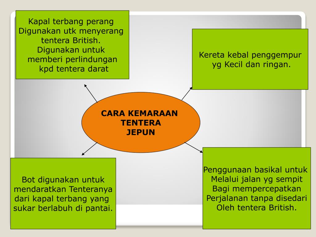 Kapal terbang perang Digunakan utk menyerang tentera British. Digunakan untuk memberi perlindungan kpd tentera darat Kereta kebal penggempur yg Kecil dan ringan. CARA KEMARAAN TENTERA JEPUN Penggunaan basikal untuk Melalui jalan yg sempit Bagi mempercepatkan Perjalanan tanpa disedari Oleh tentera British. Bot digunakan untuk mendaratkan Tenteranya dari kapal terbang yang sukar berlabuh di pantai.