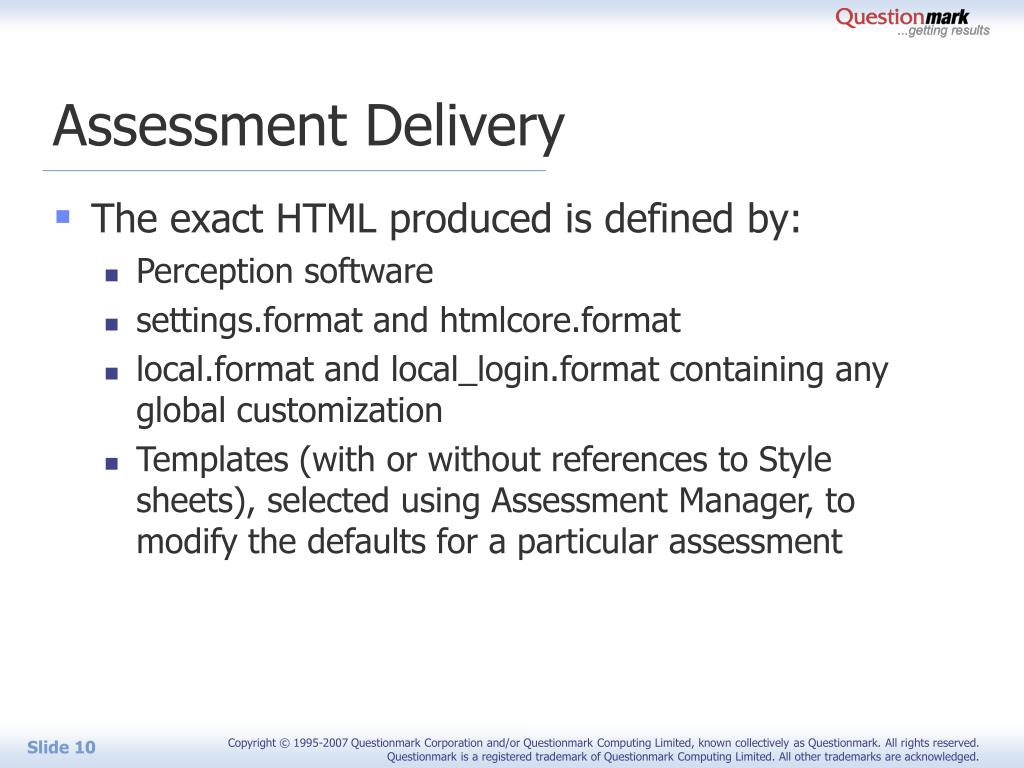 Assessment Delivery • The exact HTML produced is defined by: • Perception software • settings.format and htmlcore.format • local.format and local_login.format containing any global customization • Templates (with or without references to Style sheets), selected using Assessment Manager, to modify the defaults for a particular assessment