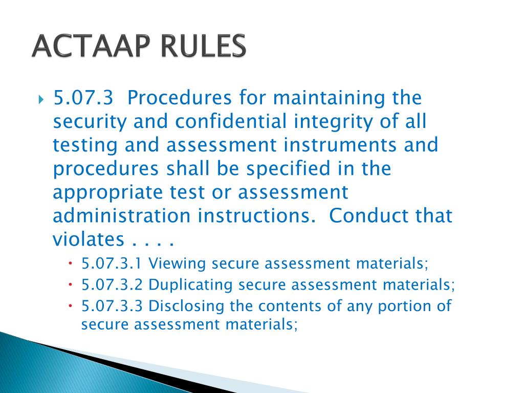 ACTAAP RULES • 5.07.3 Procedures for maintaining the security and confidential integrity of all testing and assessment instruments and procedures shall be specified in the appropriate test or assessment administration instructions. Conduct that violates . . . . • 5.07.3.1 Viewing secure assessment materials; • 5.07.3.2 Duplicating secure assessment materials; • 5.07.3.3 Disclosing the contents of any portion of secure assessment materials;