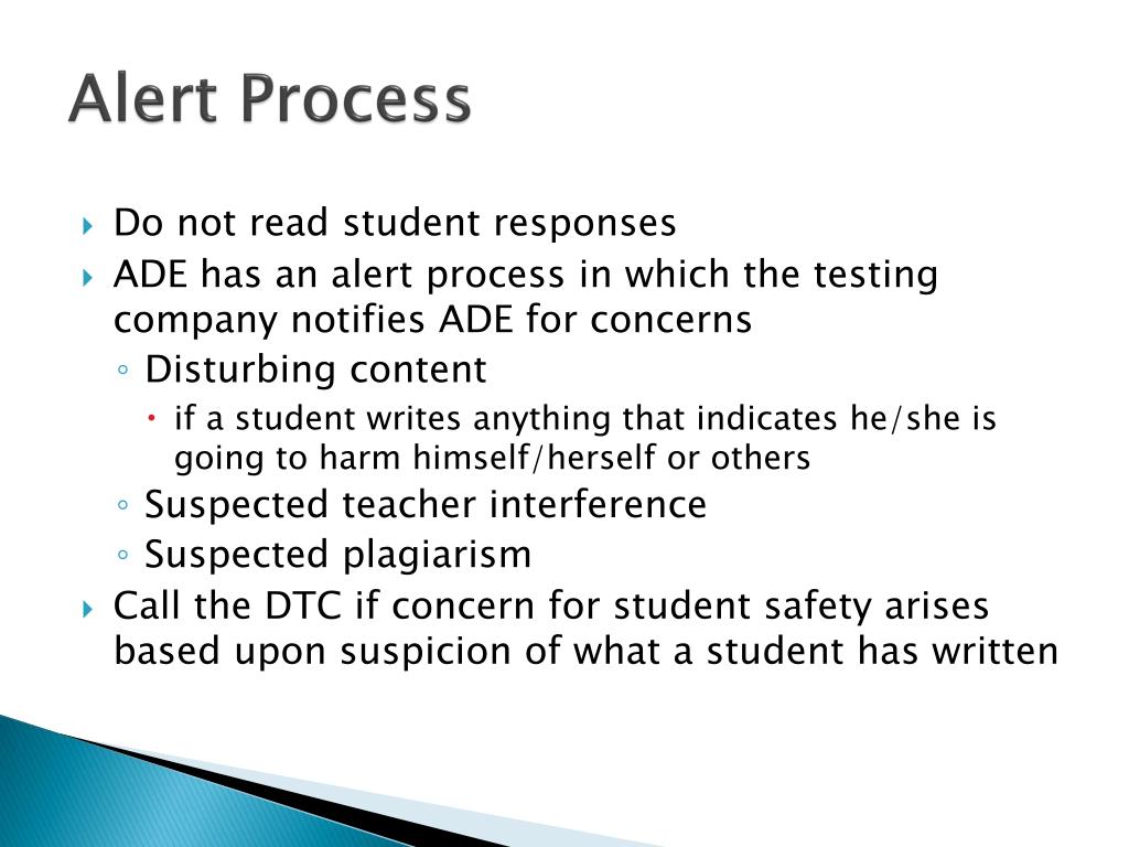 Alert Process • Do not read student responses • ADE has an alert process in which the testing company notifies ADE for concerns • Disturbing content • if a student writes anything that indicates he/she is going to harm himself/herself or others • Suspected teacher interference • Suspected plagiarism • Call the DTC if concern for student safety arises based upon suspicion of what a student has written