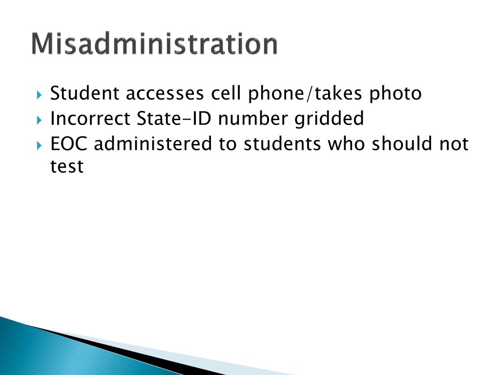 Misadministration • Student accesses cell phone/takes photo • Incorrect State-ID number gridded • EOC administered to students who should not test