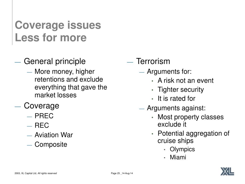 General principle More money, higher retentions and exclude everything that gave the market losses Coverage PREC REC Aviation War Composite Terrorism Arguments for: A risk not an event Tighter security It is rated for Arguments against: Most property classes exclude it Potential aggregation of cruise ships Olympics Miami Coverage issuesLess for more
