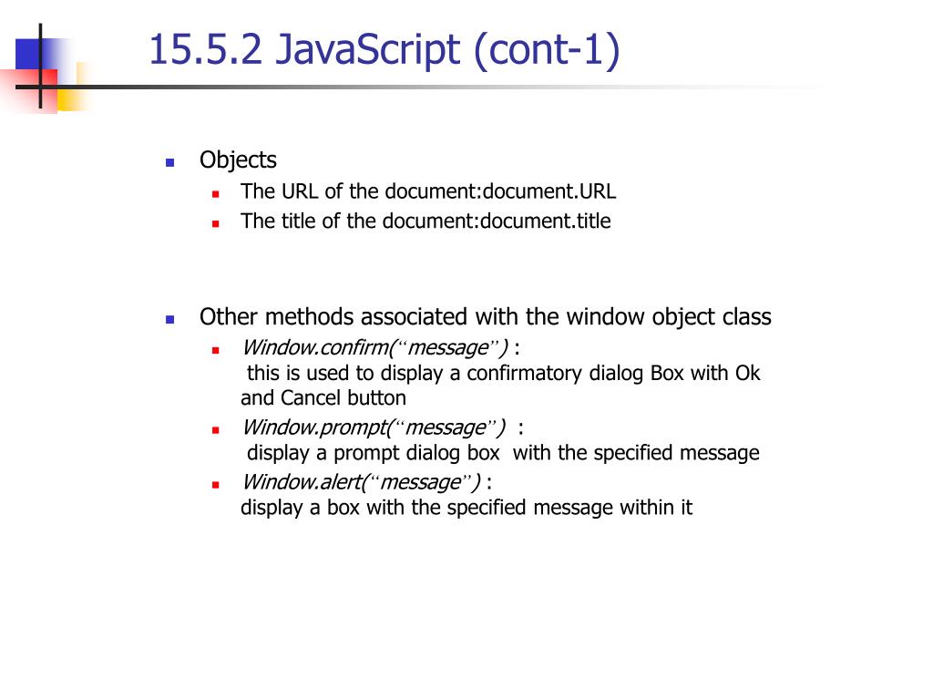 15.5.2 JavaScript (cont-1) • Objects • The URL of the document:document.URL • The title of the document:document.title • Other methods associated with the window object class • Window.confirm(“message”) : this is used to display a confirmatory dialog Box with Ok and Cancel button • Window.prompt(“message”) : display a prompt dialog box with the specified message • Window.alert(“message”) : display a box with the specified message within it