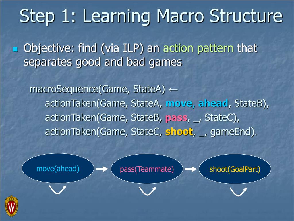 Step 1: Learning Macro Structure move(ahead) pass(Teammate) shoot(GoalPart) • Objective: find (via ILP) an action pattern that separates good and bad games macroSequence(Game, StateA) ← actionTaken(Game, StateA, move, ahead, StateB), actionTaken(Game, StateB, pass, _, StateC), actionTaken(Game, StateC, shoot, _, gameEnd).