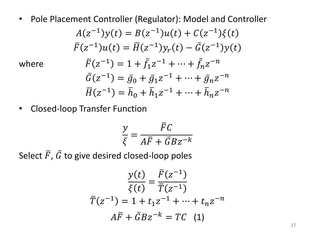 Pole placement controller (Servo) Place poles/cancel zeros (avoid direct inversion of process model) • Design Rationale: (1) Open-loop zeros which are not desired as closed-loop zeros must appear in . (2) Open-loop zeros which are not desired as controller poles in F must appear in . (example: zeros outside unit circle) (3) Specify (integral action, closed-loop gain = 1)