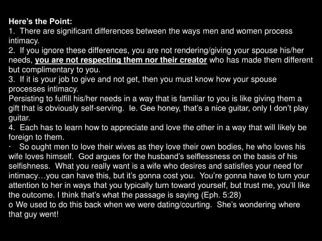 Here’s the Point: 1. There are significant differences between the ways men and women process intimacy. 2. If you ignore these differences, you are not rendering/giving your spouse his/her needs, you are not respecting them nor their creator who has made them different but complimentary to you. 3. If it is your job to give and not get, then you must know how your spouse processes intimacy. Persisting to fulfill his/her needs in a way that is familiar to you is like giving them a gift that is obviously self-serving. Ie. Gee honey, that’s a nice guitar, only I don’t play guitar. 4. Each has to learn how to appreciate and love the other in a way that will likely be foreign to them. ·So ought men to love their wives as they love their own bodies, he who loves his wife loves himself. God argues for the husband’s selflessness on the basis of his selfishness. What you really want is a wife who desires and satisfies your need for intimacy…you can have this, but it’s gonna cost you. You’re gonna have to turn your attention to her in ways that you typically turn toward yourself, but trust me, you’ll like the outcome. I think that’s what the passage is saying (Eph. 5:28) oWe used to do this back when we were dating/courting. She’s wondering where that guy went!