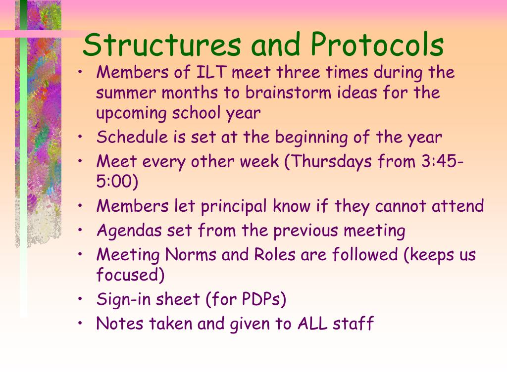 Structures and Protocols • Members of ILT meet three times during the summer months to brainstorm ideas for the upcoming school year • Schedule is set at the beginning of the year • Meet every other week (Thursdays from 3:45-5:00) • Members let principal know if they cannot attend • Agendas set from the previous meeting • Meeting Norms and Roles are followed (keeps us focused) • Sign-in sheet (for PDPs) • Notes taken and given to ALL staff
