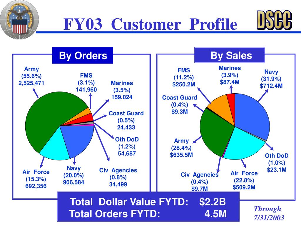 DSCC FY03 Customer Profile By Sales By Orders Marines (3.9%) $87.4M Army (55.6%) 2,525,471 FMS (11.2%) $250.2M Navy (31.9%) $712.4M FMS (3.1%) 141,960 Marines (3.5%) 159,024 Coast Guard (0.4%) $9.3M Coast Guard (0.5%) 24,433 Oth DoD (1.2%) 54,687 Army (28.4%) $635.5M Oth DoD (1.0%) $23.1M Navy (20.0%) 906,584 Civ Agencies (0.8%) 34,499 Air Force (15.3%) 692,356 Air Force (22.8%) $509.2M Civ Agencies (0.4%) $9.7M Total Dollar Value FYTD: $2.2B Total Orders FYTD: 4.5M Through 7/31/2003 01CustomerProfile:kdf:22Oct 01