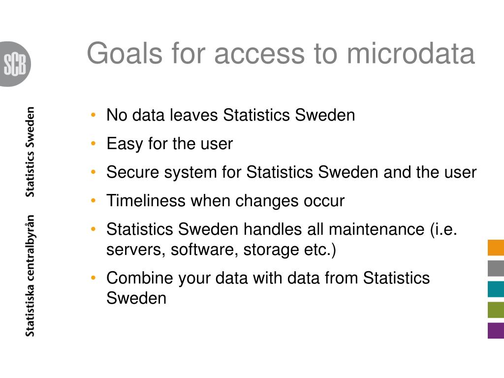 Goals for access to microdata • No data leaves Statistics Sweden • Easy for the user • Secure system for Statistics Sweden and the user • Timeliness when changes occur • Statistics Sweden handles all maintenance (i.e. servers, software, storage etc.) • Combine your data with data from Statistics Sweden