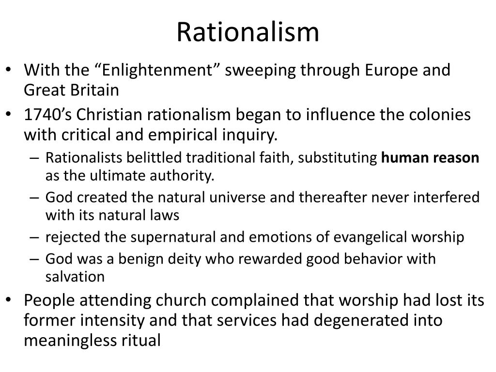 Rationalism • With the “Enlightenment” sweeping through Europe and Great Britain • 1740’s Christian rationalism began to influence the colonies with critical and empirical inquiry. • Rationalists belittled traditional faith, substituting human reason as the ultimate authority. • God created the natural universe and thereafter never interfered with its natural laws • rejected the supernatural and emotions of evangelical worship • God was a benign deity who rewarded good behavior with salvation • People attending church complained that worship had lost its former intensity and that services had degenerated into meaningless ritual