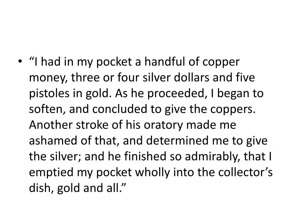 “I had in my pocket a handful of copper money, three or four silver dollars and five pistoles in gold. As he proceeded, I began to soften, and concluded to give the coppers. Another stroke of his oratory made me ashamed of that, and determined me to give the silver; and he finished so admirably, that I emptied my pocket wholly into the collector’s dish, gold and all.”