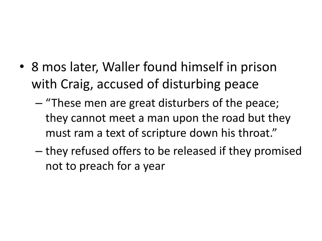 8 mos later, Waller found himself in prison with Craig, accused of disturbing peace • “These men are great disturbers of the peace; they cannot meet a man upon the road but they must ram a text of scripture down his throat.” • they refused offers to be released if they promised not to preach for a year