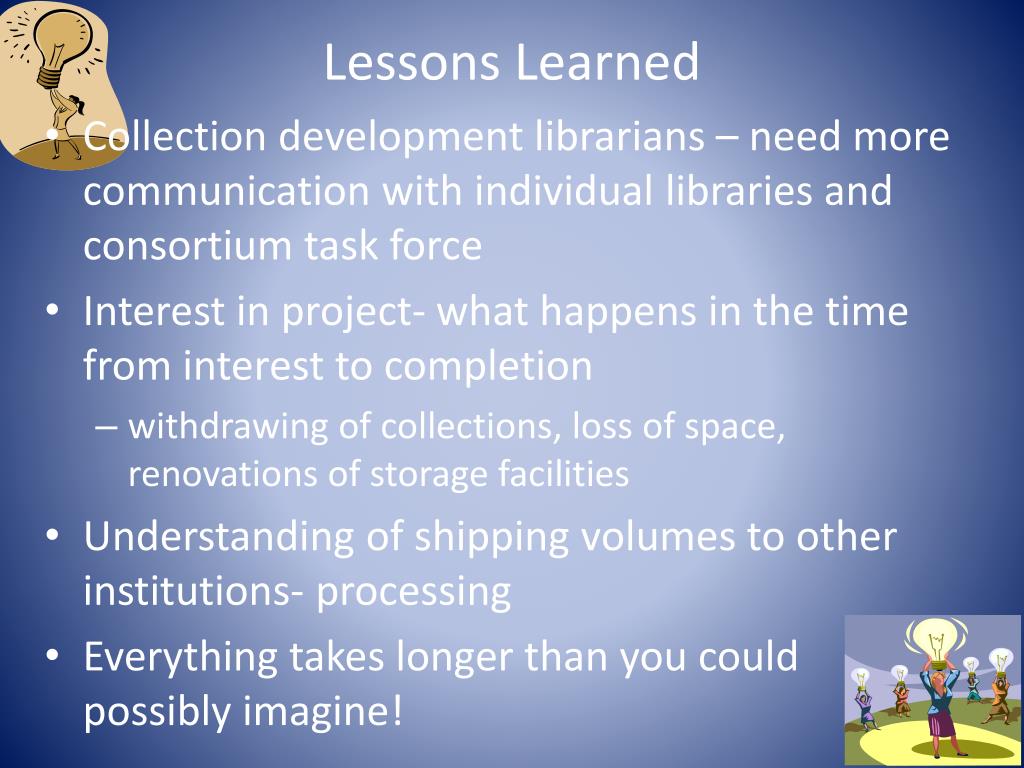 Lessons Learned • Collection development librarians – need more communication with individual libraries and consortium task force • Interest in project- what happens in the time from interest to completion • withdrawing of collections, loss of space, renovations of storage facilities • Understanding of shipping volumes to other institutions- processing • Everything takes longer than you could possibly imagine!