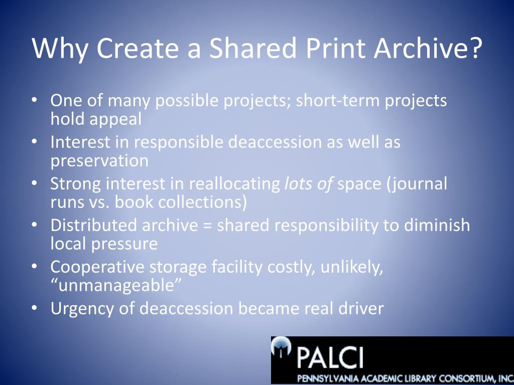Why Create a Shared Print Archive? • One of many possible projects; short-term projects hold appeal • Interest in responsible deaccession as well as preservation • Strong interest in reallocating lots of space (journal runs vs. book collections) • Distributed archive = shared responsibility to diminish local pressure • Cooperative storage facility costly, unlikely, “unmanageable” • Urgency of deaccession became real driver
