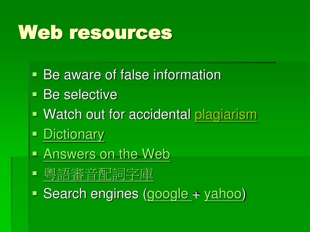 Web resources • Be aware of false information • Be selective • Watch out for accidental plagiarism • Dictionary • Answers on the Web • 粵語審音配詞字庫 • Search engines (google + yahoo)