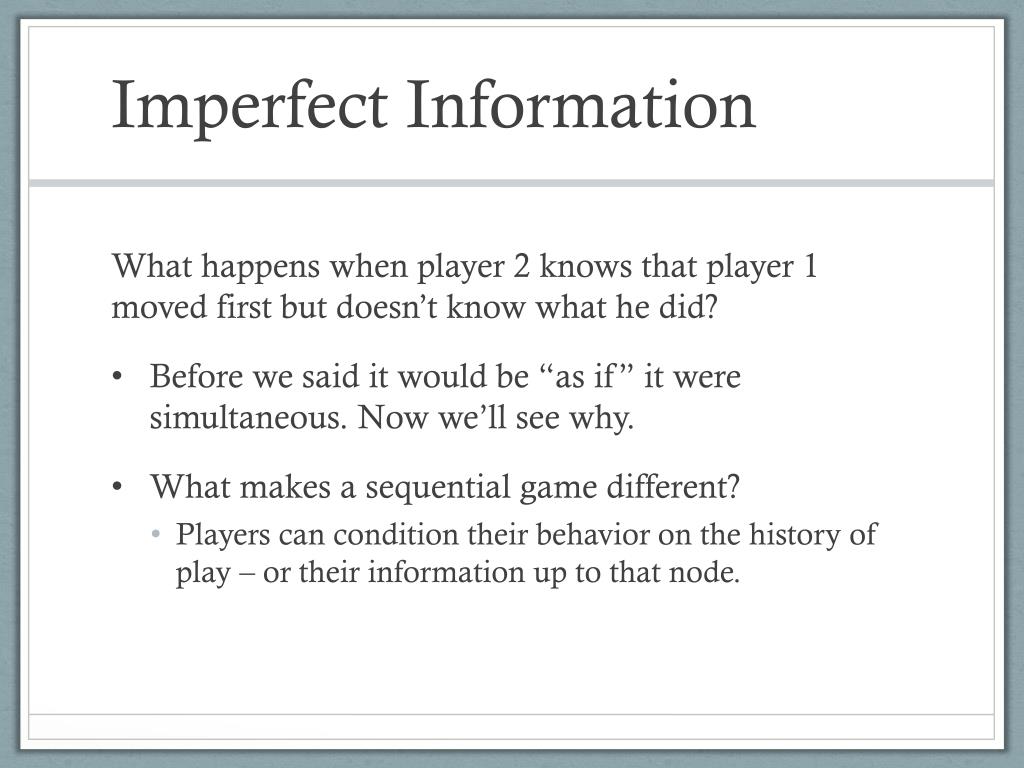 Imperfect Information What happens when player 2 knows that player 1 moved first but doesn’t know what he did? • Before we said it would be “as if” it were simultaneous. Now we’ll see why. • What makes a sequential game different? • Players can condition their behavior on the history of play – or their information up to that node.